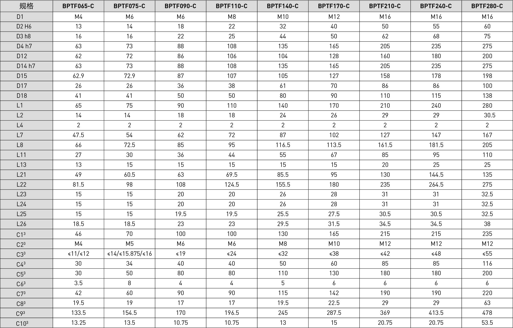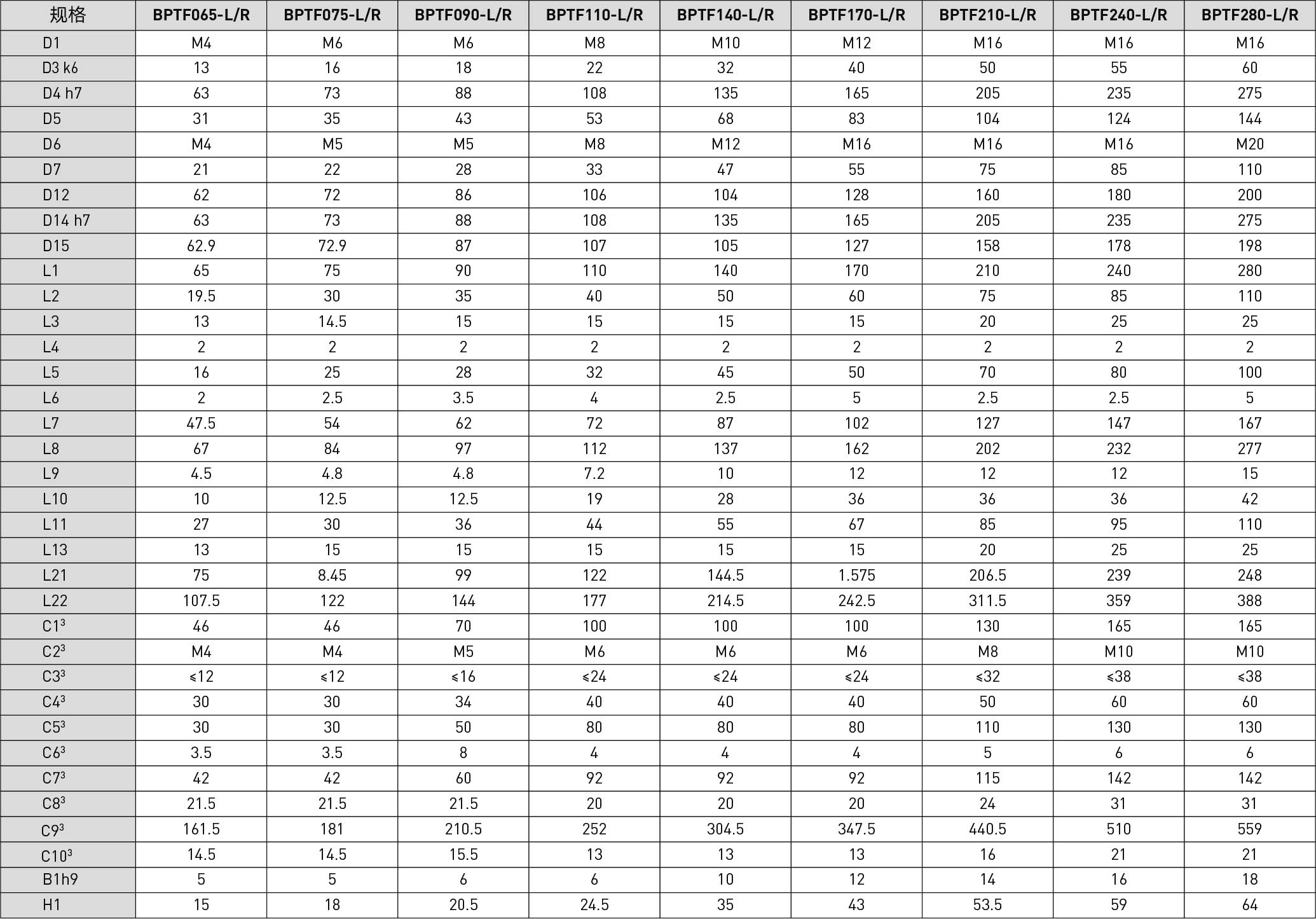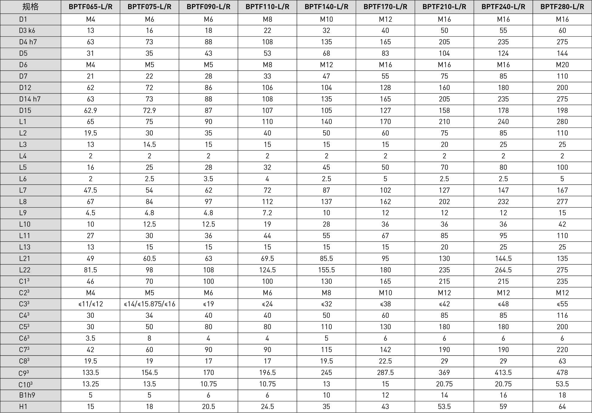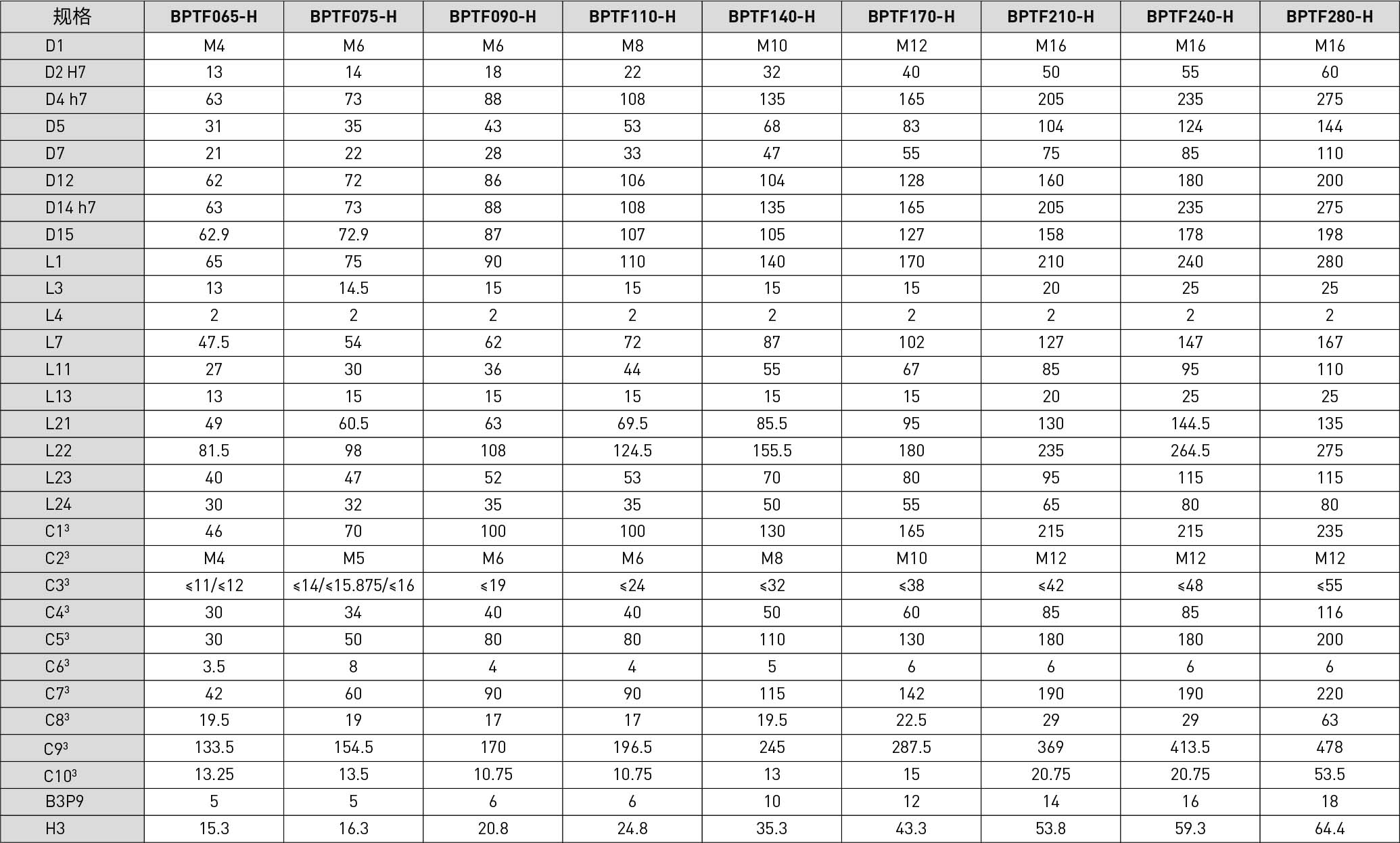 | Specifications | Unit | Reduction Ratio | BPTF065 | BPTF075 | BPTF090 | BPTF110 | BPTF140 | BPTF170 | BPTF210 | BPTF240 | BPTF280 |