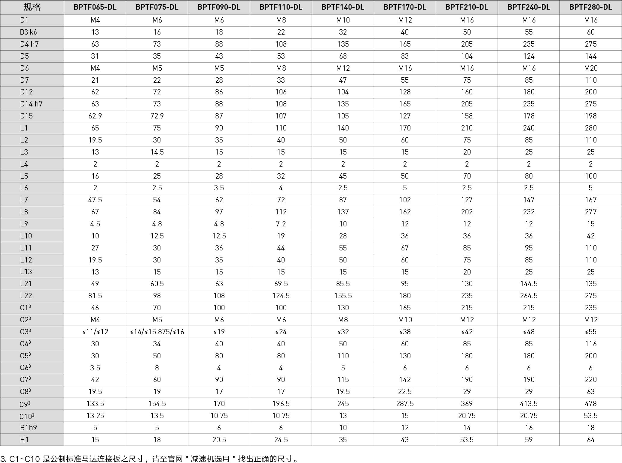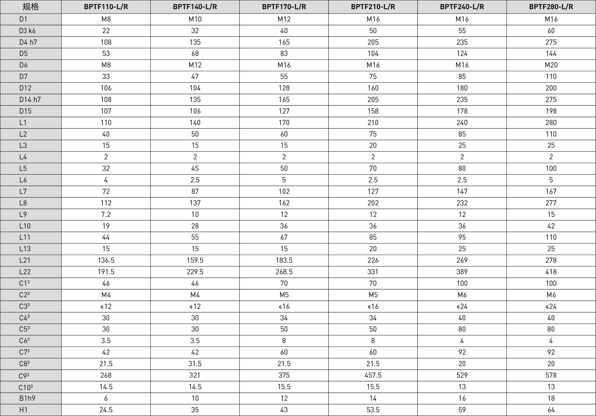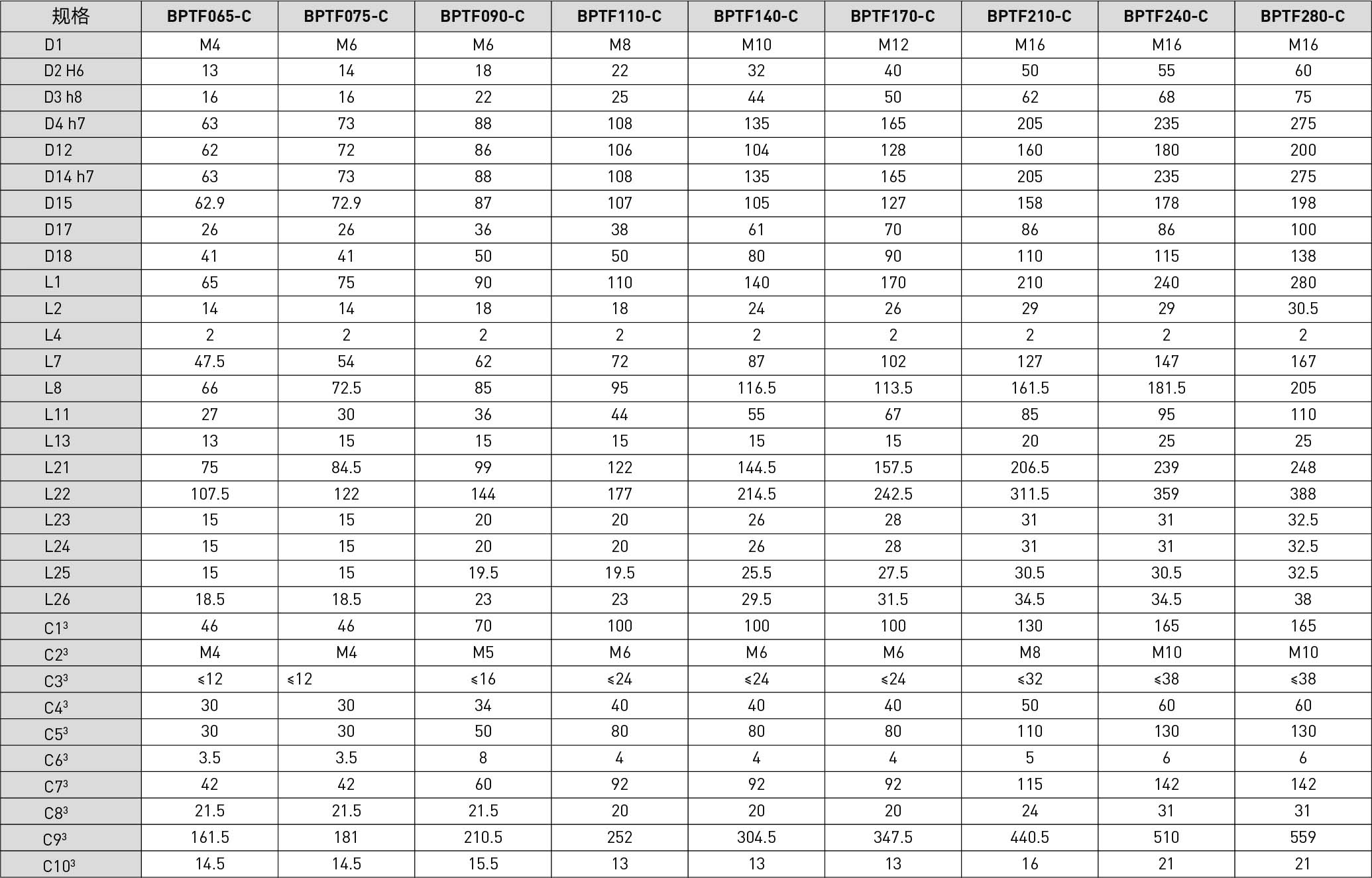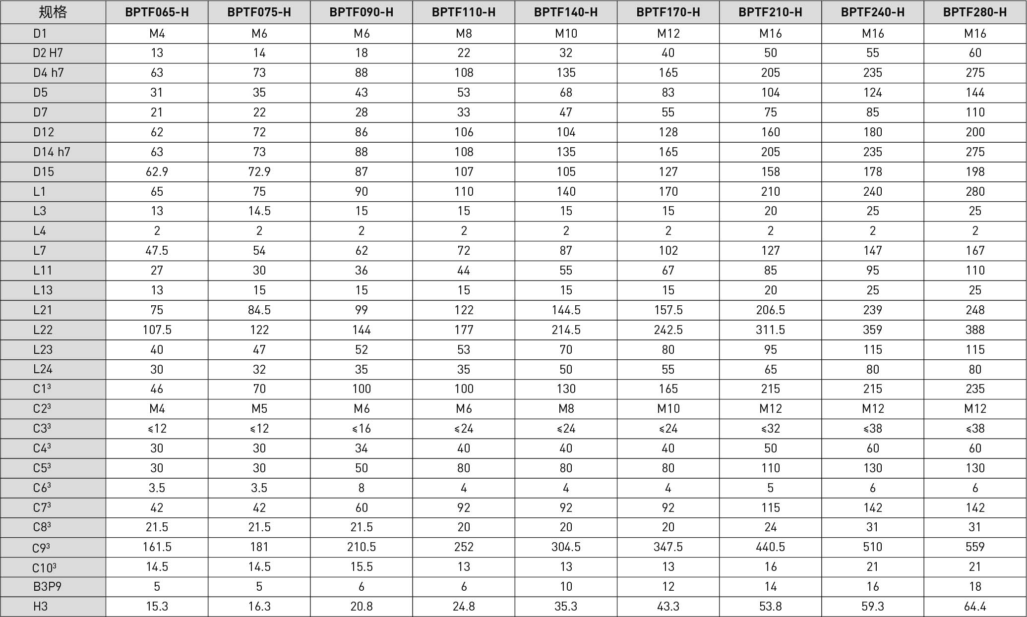 | Specifications | Unit | Reduction Ratio | BPTF065 | BPTF075 | BPTF090 | BPTF110 | BPTF140 | BPTF170 | BPTF210 | BPTF240 | BPTF280 |