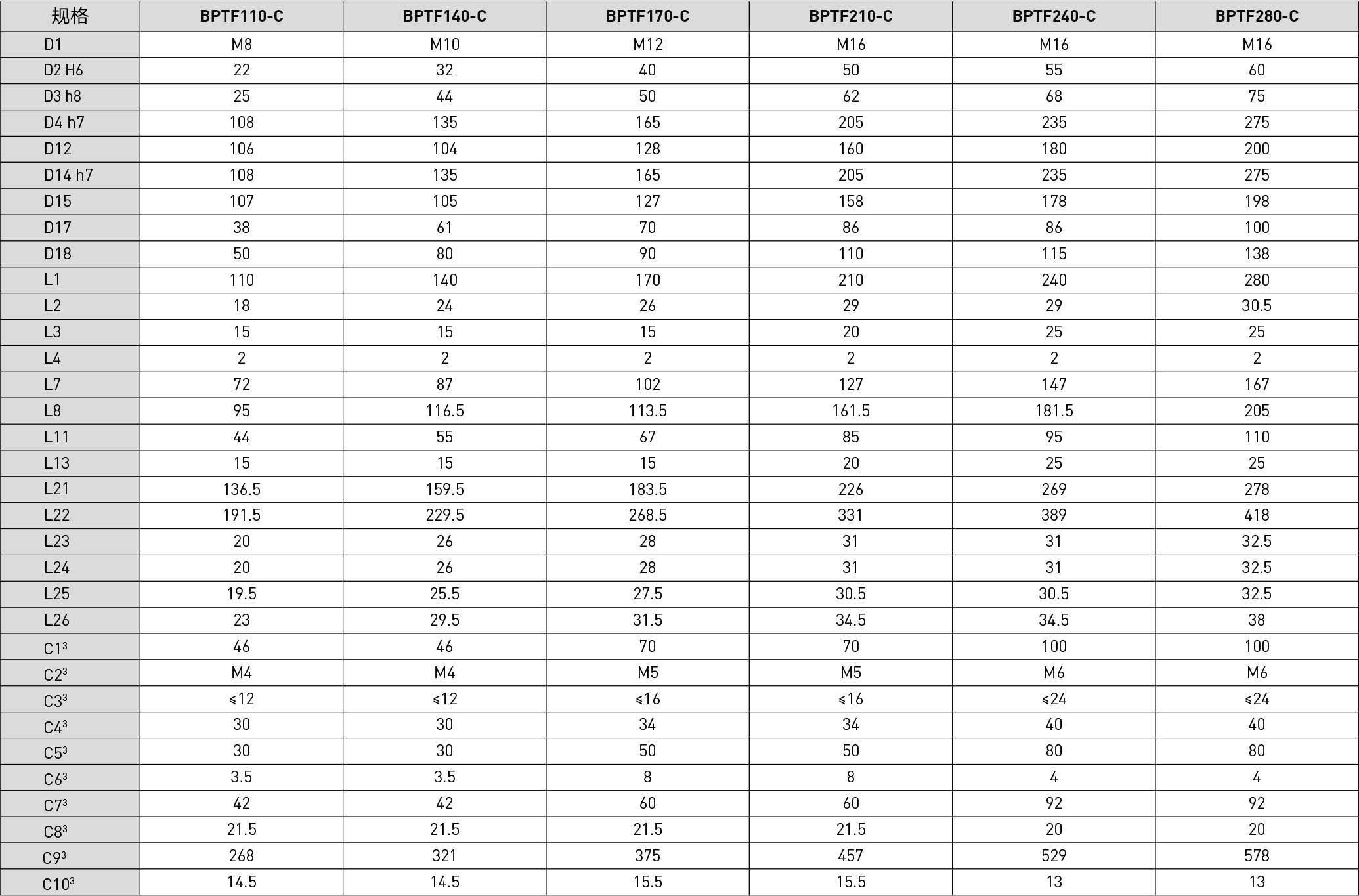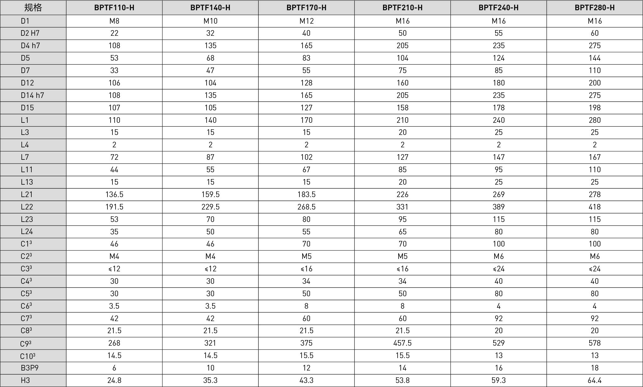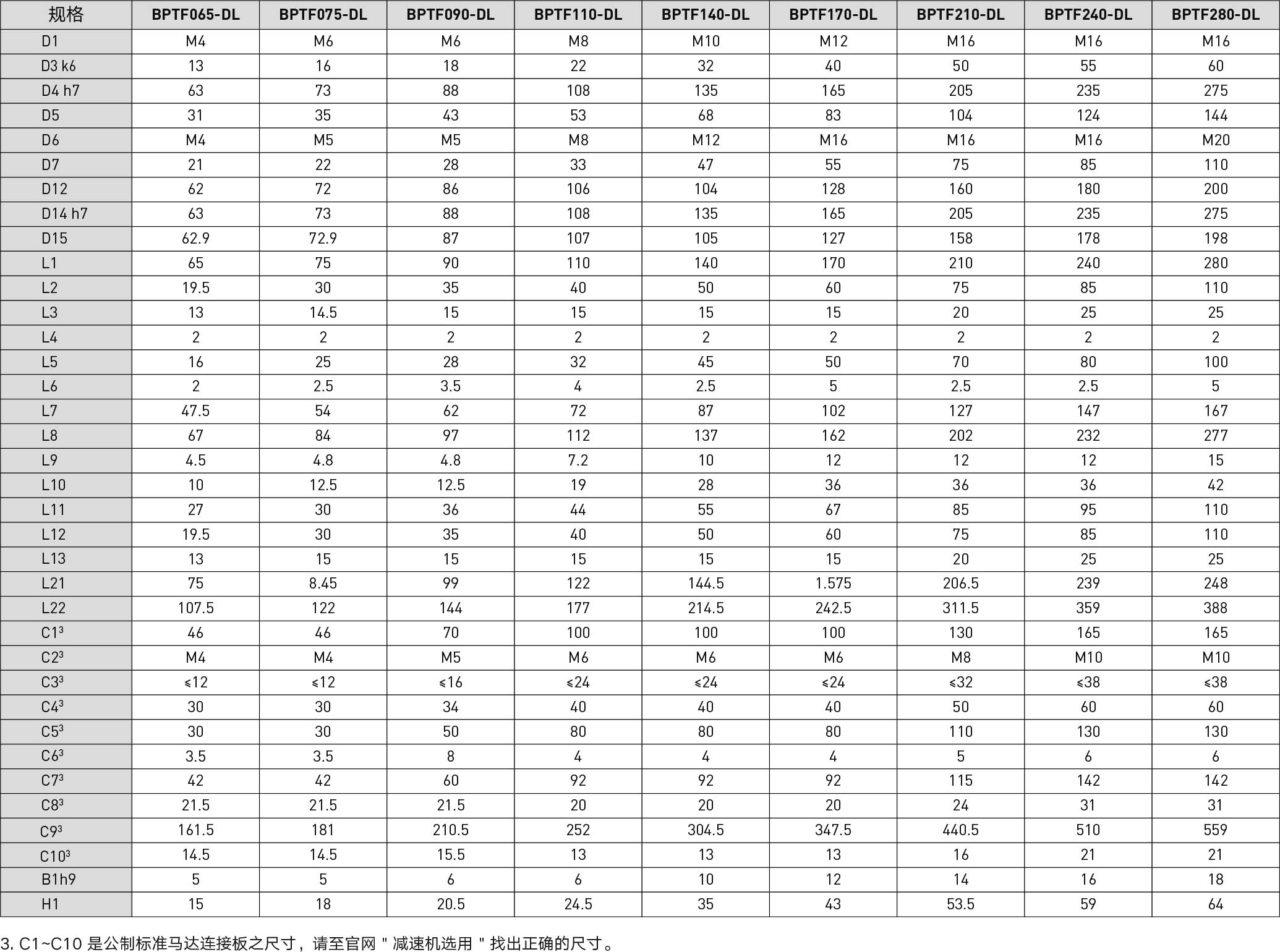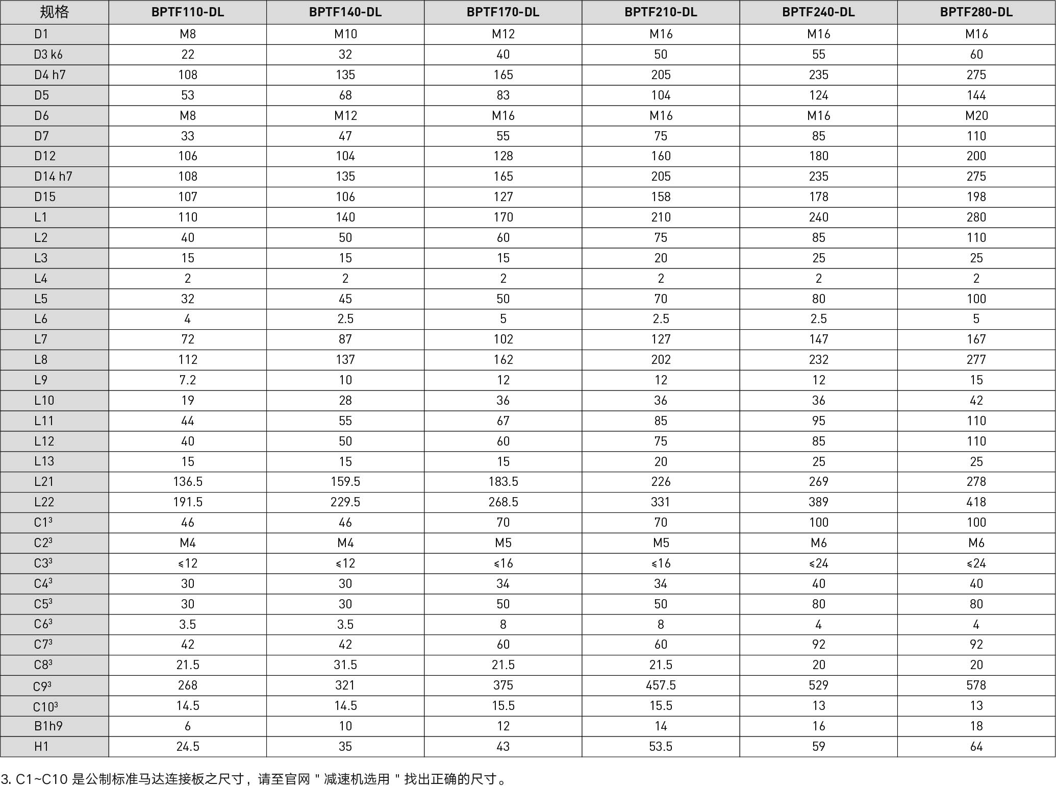 | Specifications | Unit | Reduction Ratio | BPTF065 | BPTF075 | BPTF090 | BPTF110 | BPTF140 | BPTF170 | BPTF210 | BPTF240 | BPTF280 |